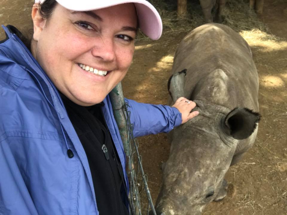 Clockwise from top left: Kelly, middle row second from right, with her study abroad group in Prague; Kelly hiking in Antarctica: Kelly at a rhino orphanage in South Africa